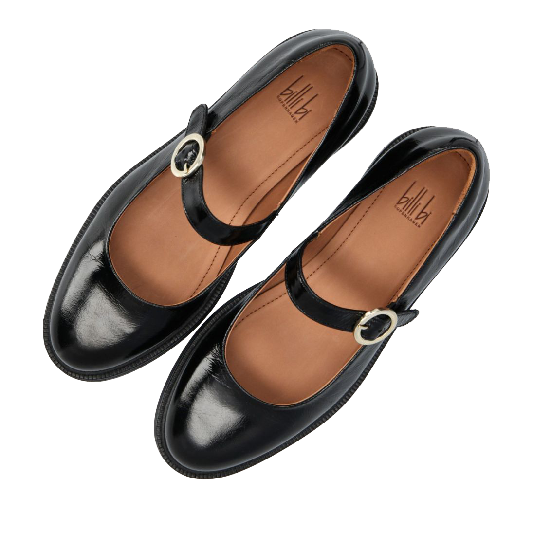 Fineste håndlavet Mary Jane ballerina fra Billi Bi. Denne ballerina er udført i sort lakeret skind med en rund tå. Henover fronten er ballerinaen dekoreret med en strop, som lukkes med et lille guldspænde.