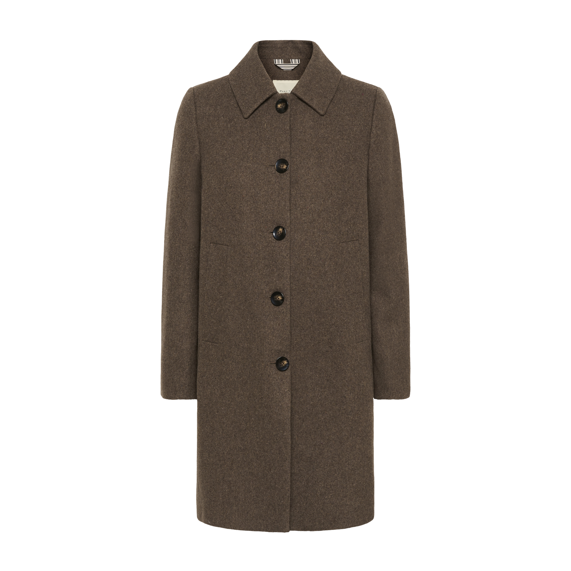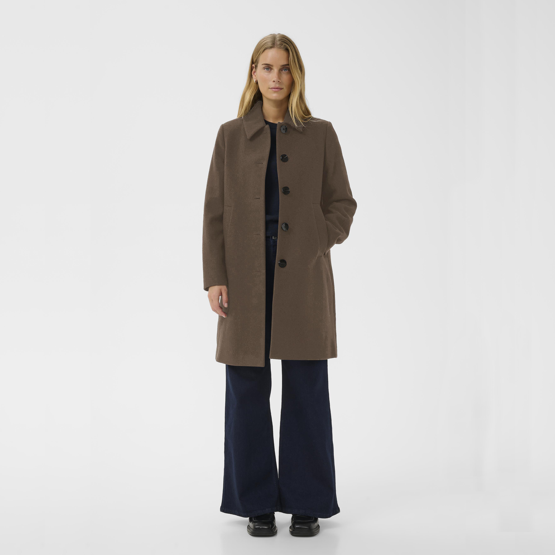 En klassisk uldfrakke med et enkelt og velafbalanceret snit fra Part Two. Den er udstyret med traditionel krave, knaplukning og skjulte sidelommer, som forener stil og funktionalitet. Det rene, minimalistiske udtryk gør frakken til et tidløst valg i garderoben – velegnet både til hverdagen og til mere elegante anledninger.